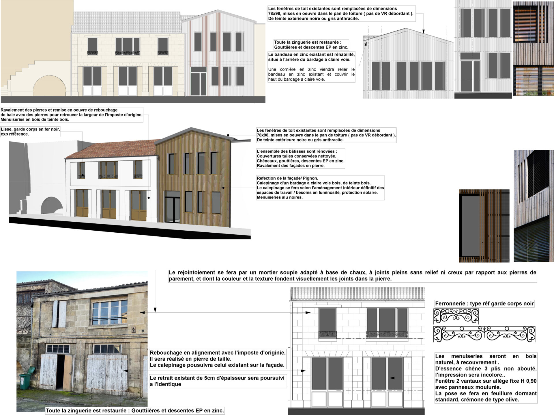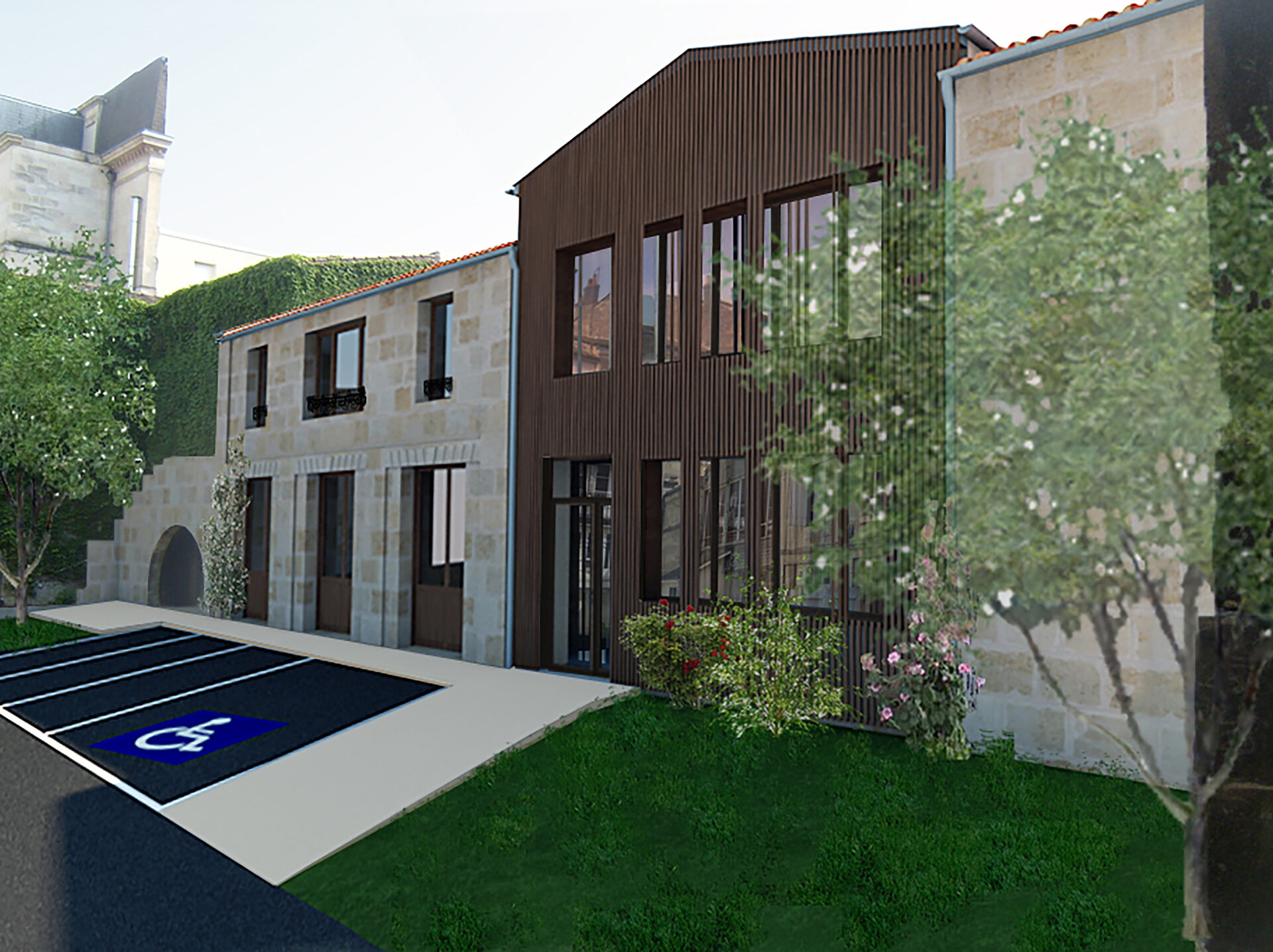 Les façades sont totalement réhabilitées et la distinction physique des 2 bâtisses d’origine a été conservée et appuyée par leurs volumétrie et le traitement différencié des façades.