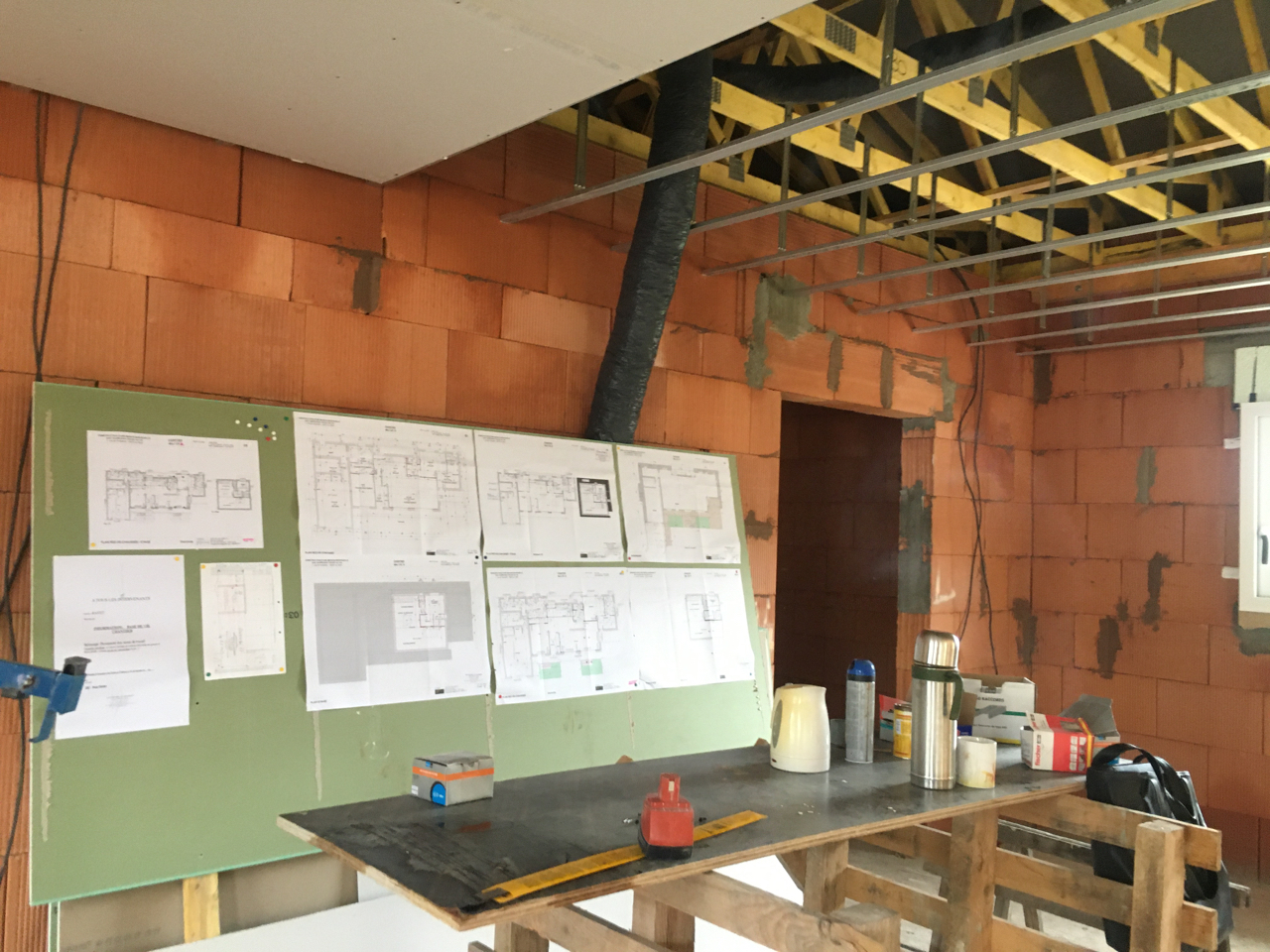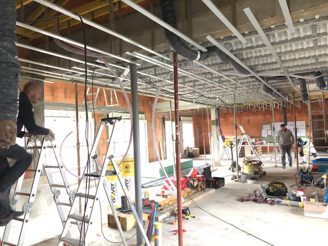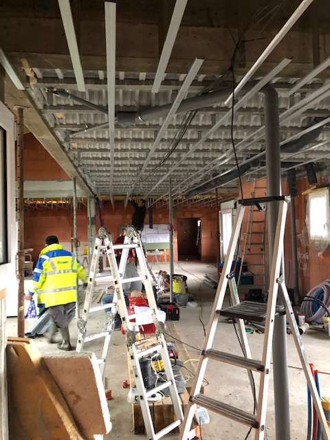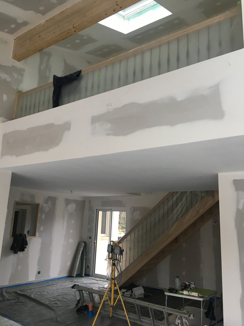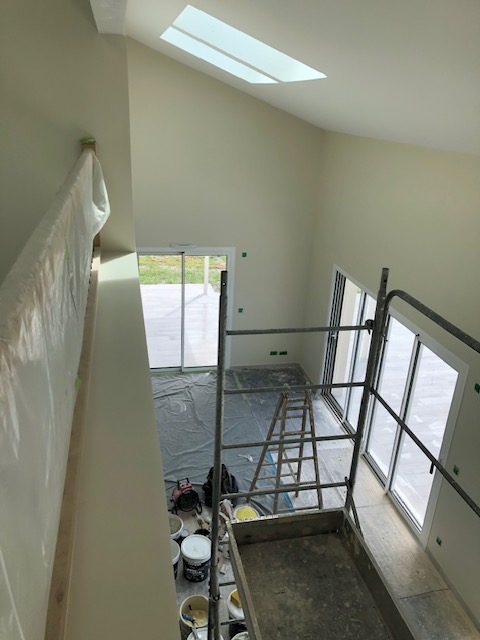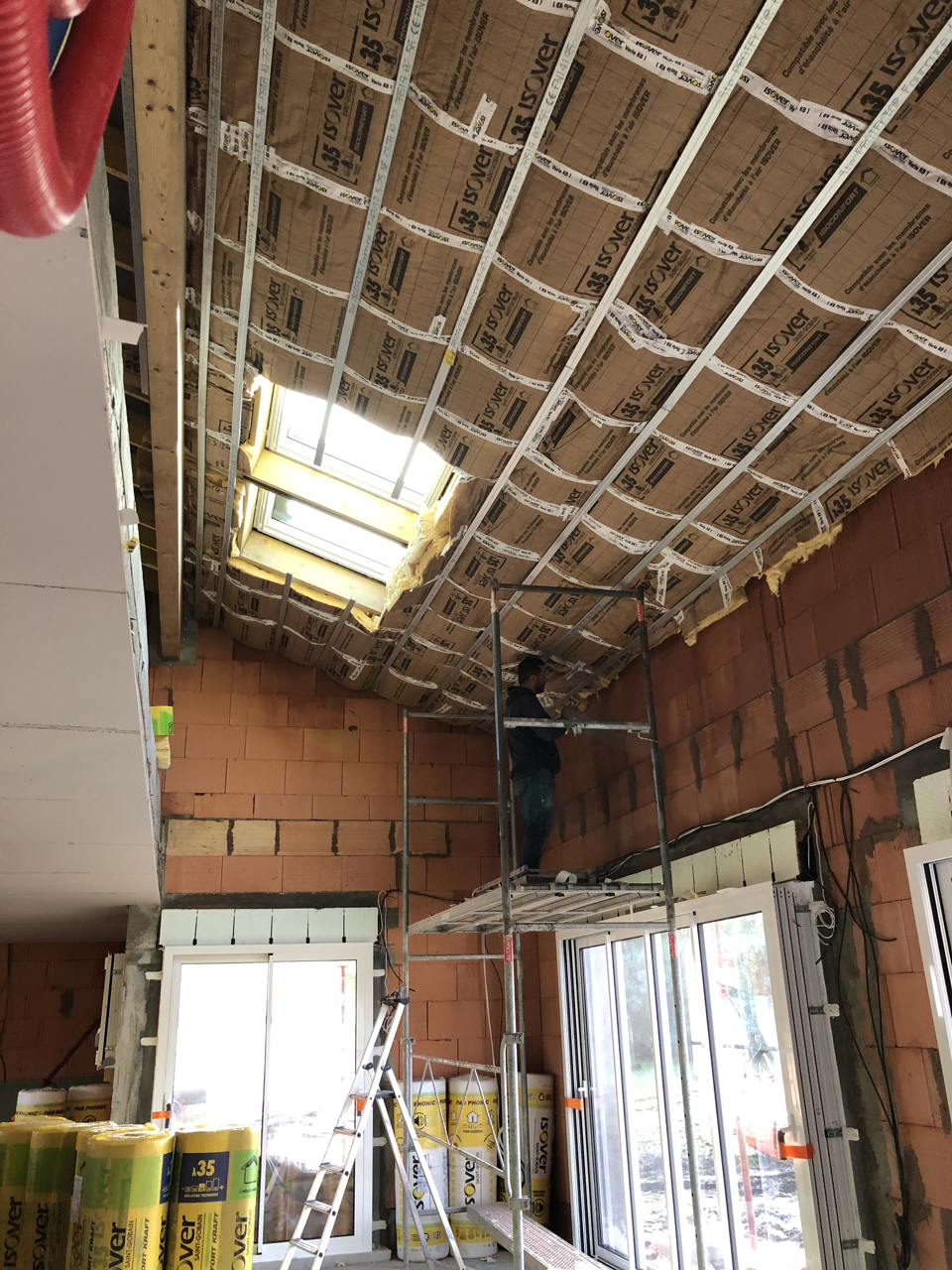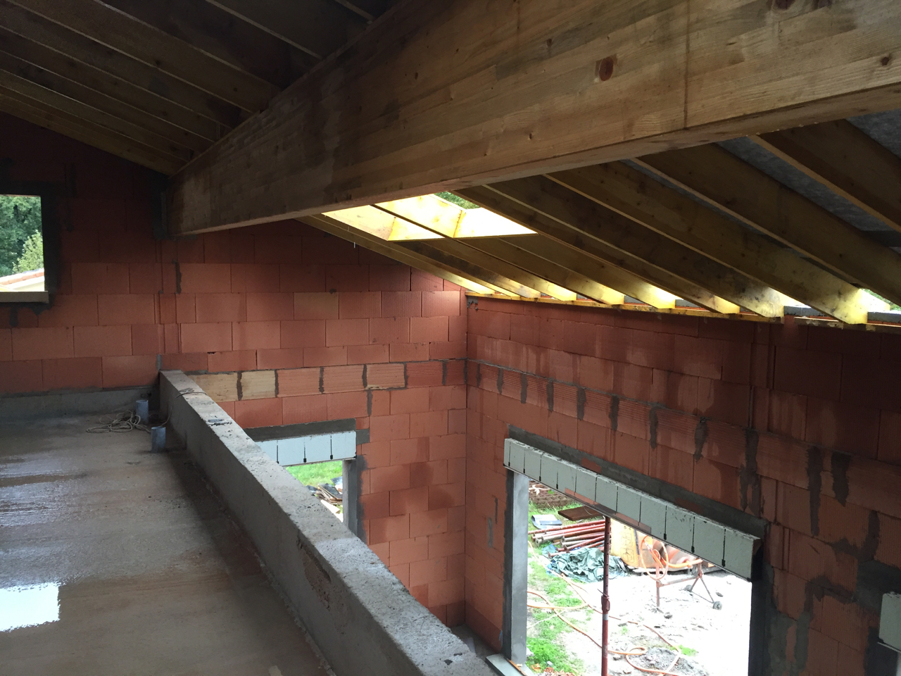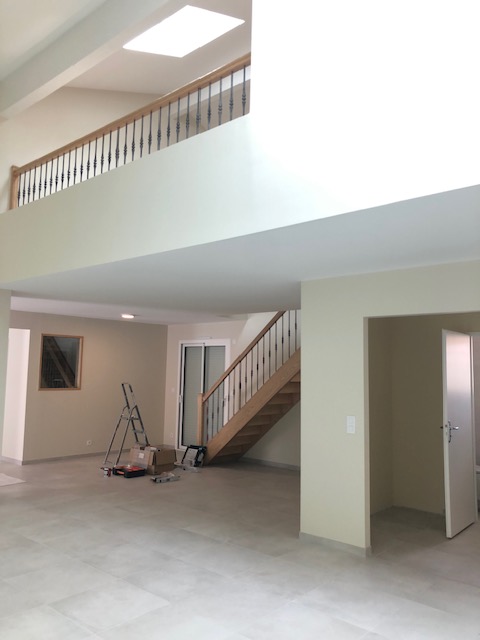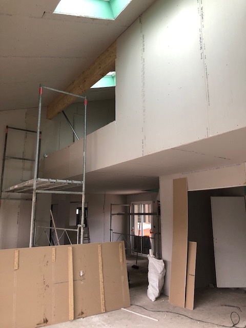 Une demande était d’intégrer en mezzanine un espace bureau et suite ouverts sur l’espace jour au rez-de-chaussée. La forme de toiture a permis d’englober l’ensemble en mettant en œuvre une charpente traditionnelle sous forme de rampants intégrant des fenêtres de toit.
