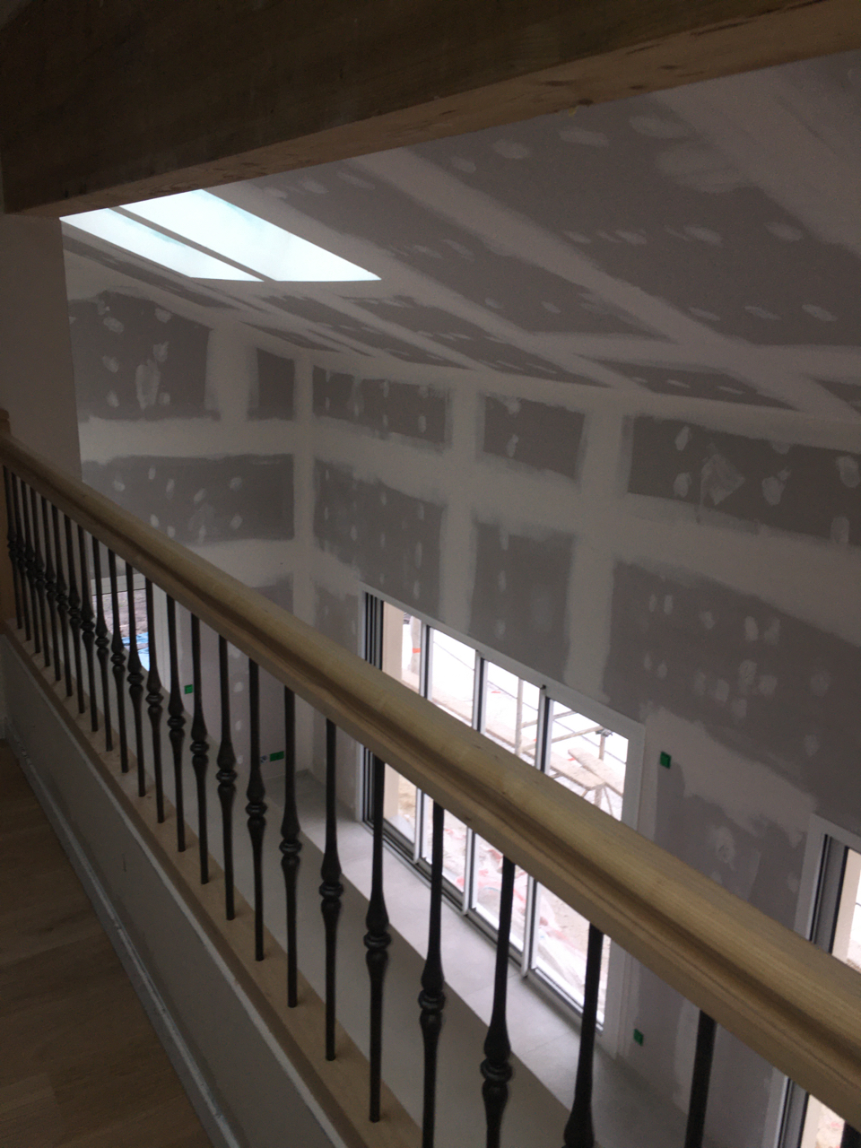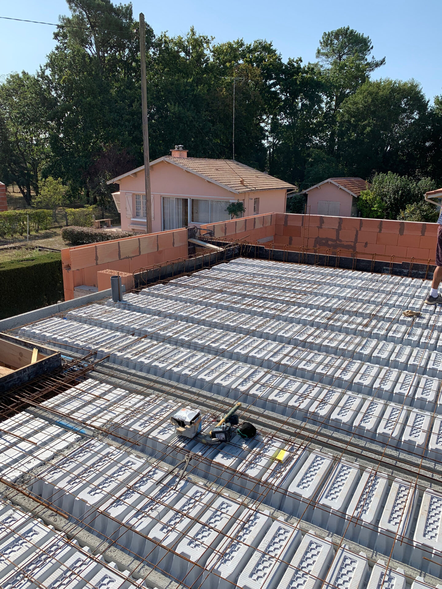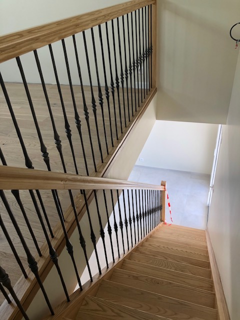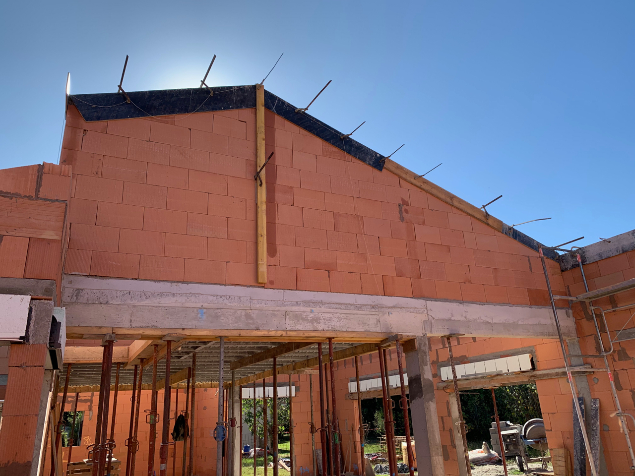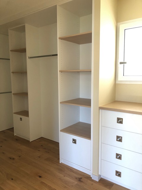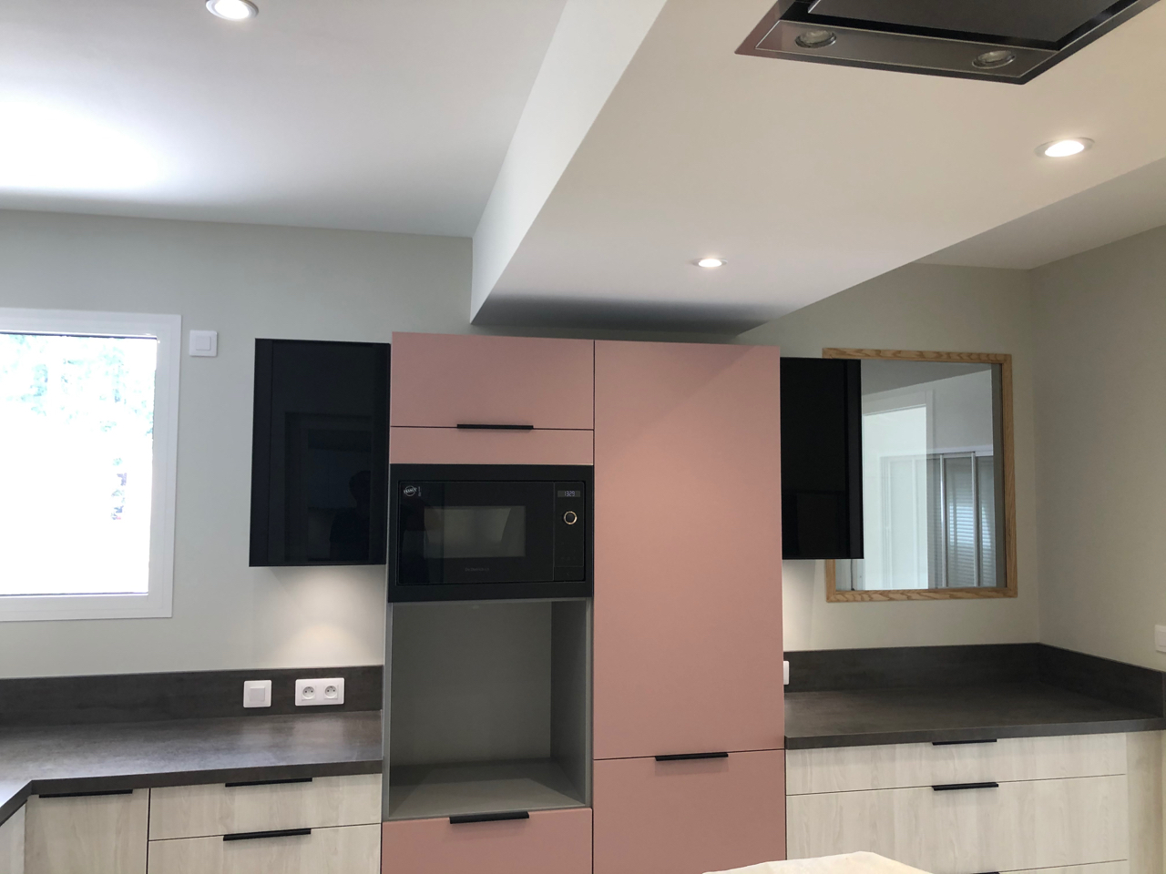 Une demande était d’intégrer en mezzanine un espace bureau et suite ouverts sur l’espace jour au rez-de-chaussée. La forme de toiture a permis d’englober l’ensemble en mettant en œuvre une charpente traditionnelle sous forme de rampants intégrant des fenêtres de toit.