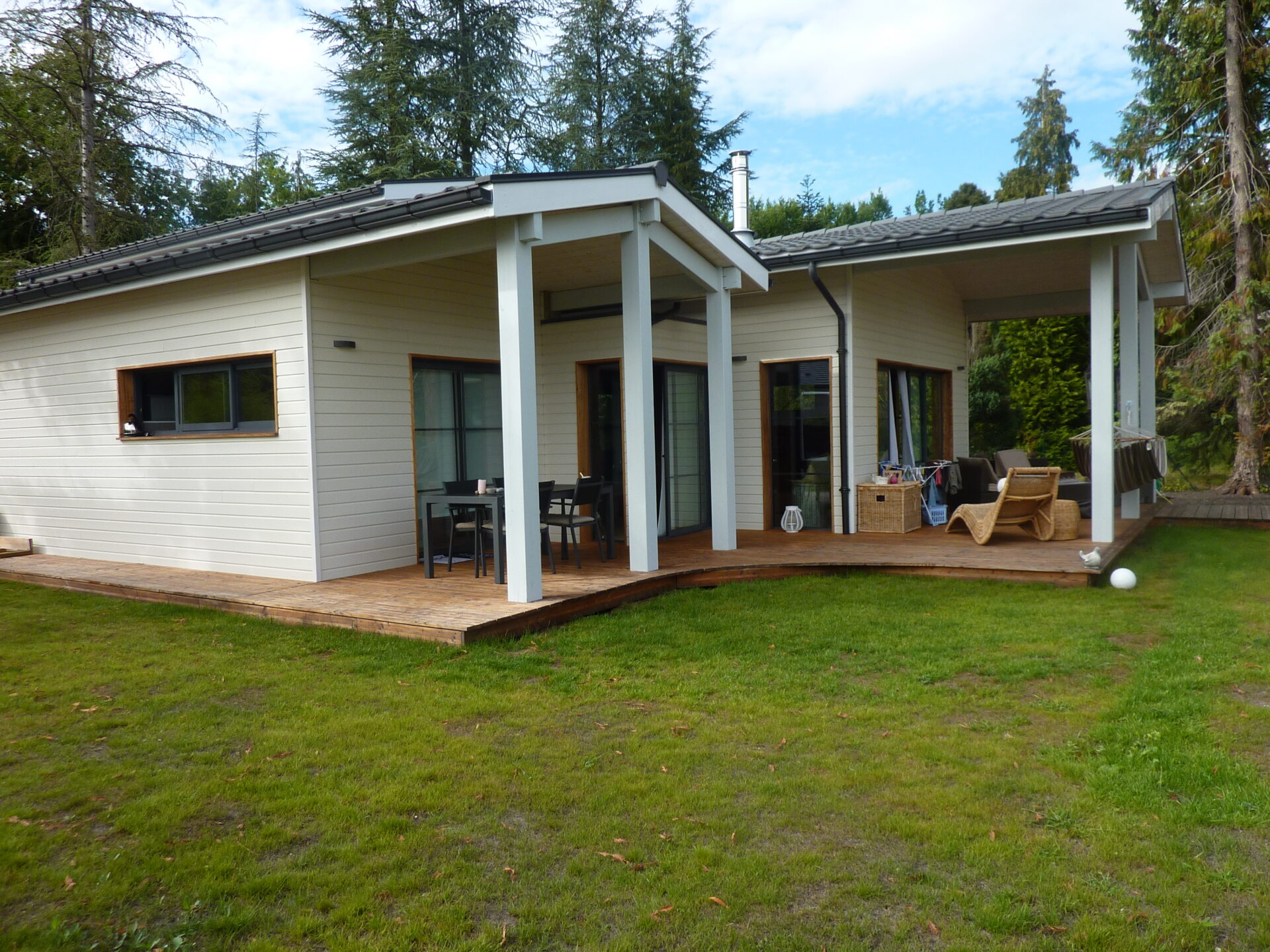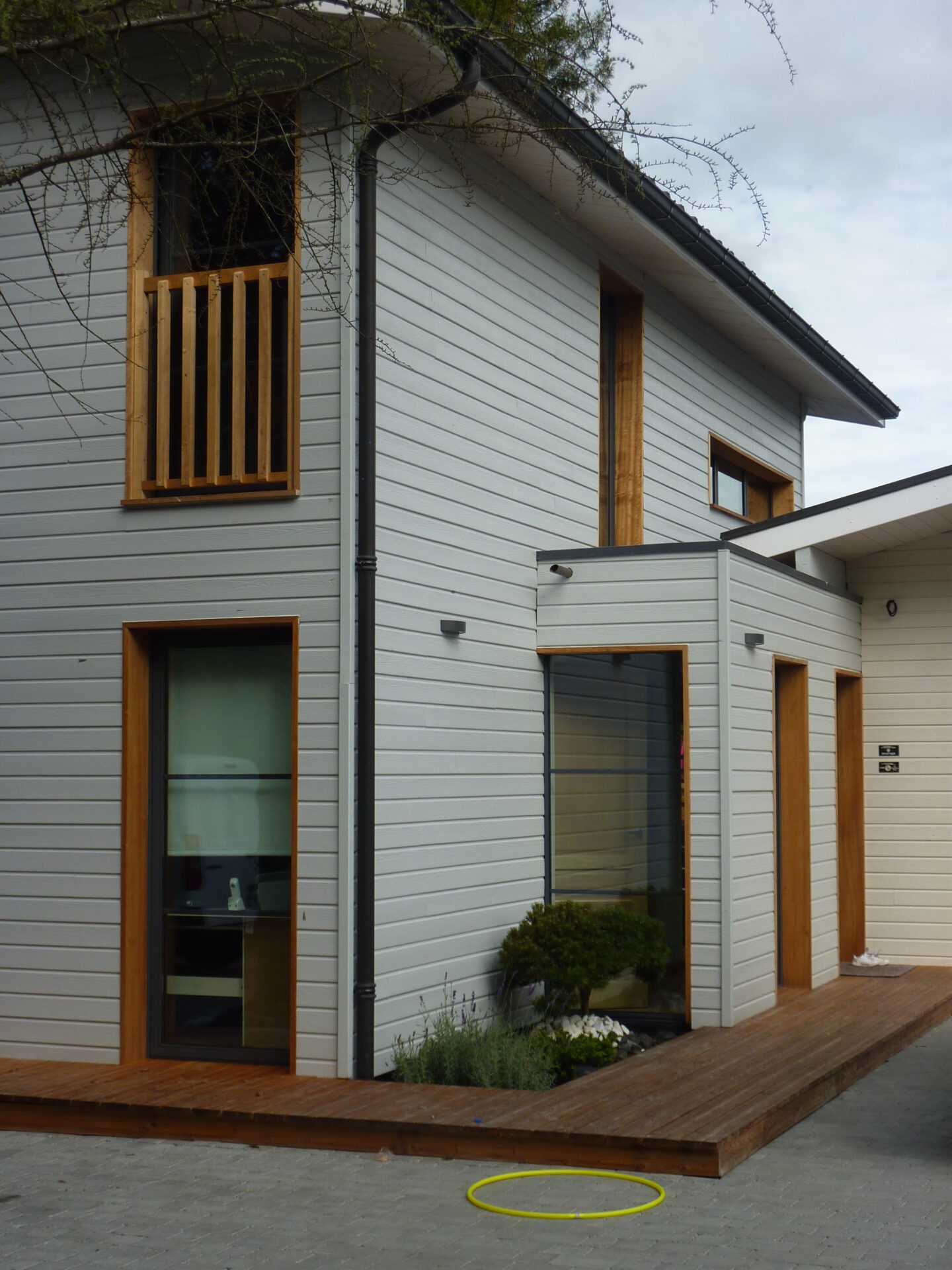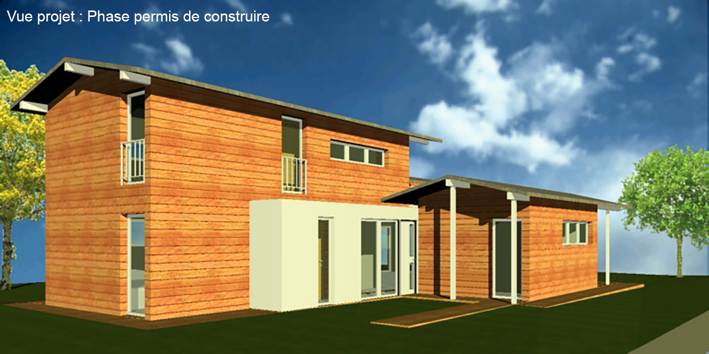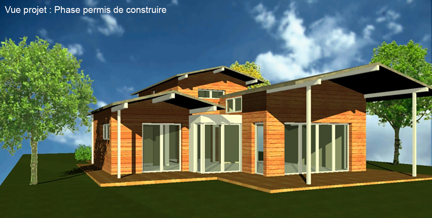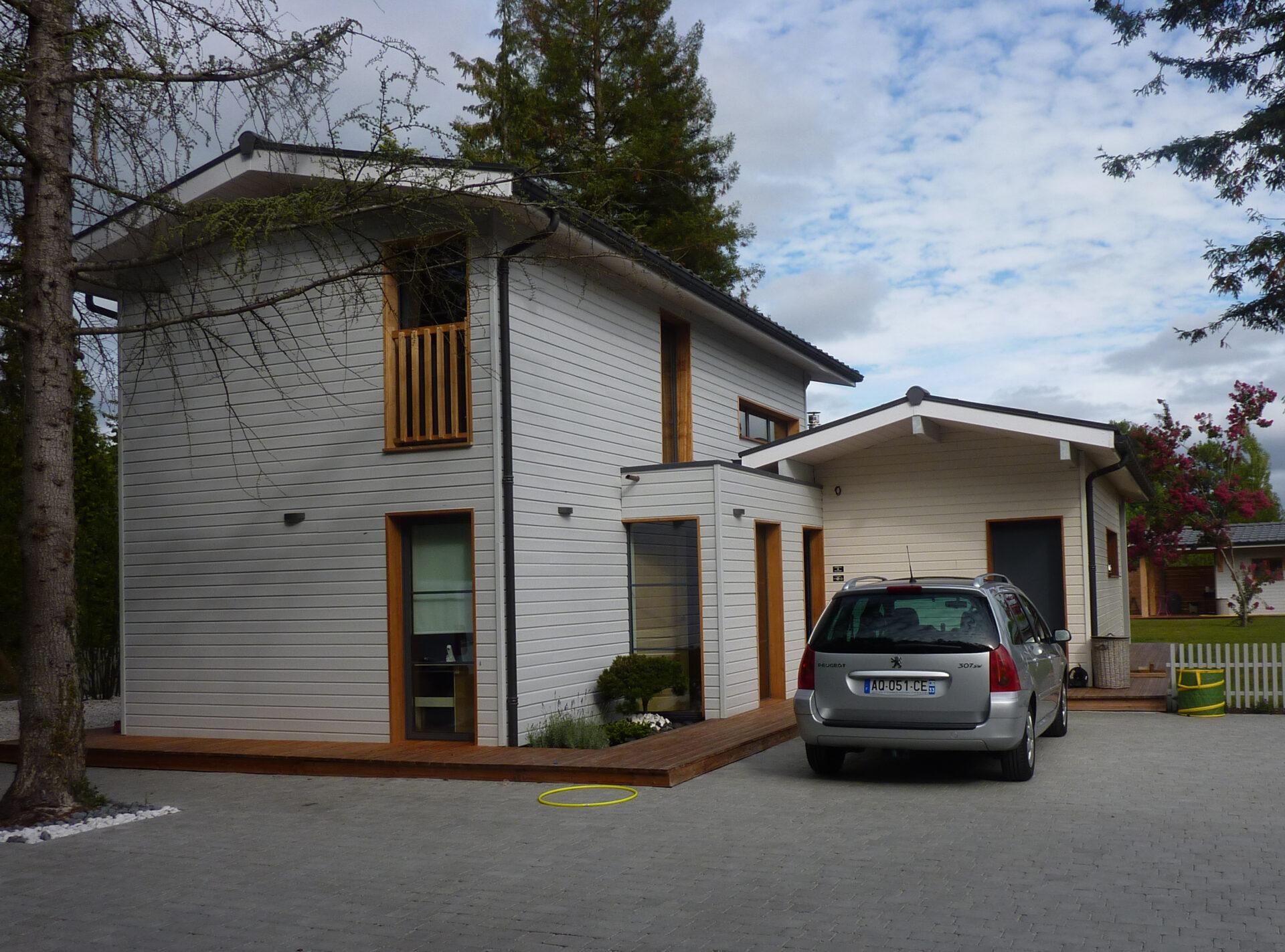 Descriptif : L’habitation a été construite en structure bois dans son ensemble. Elle s’étend en rez-de-chaussée et étage, le projet a été dessiné dans une volonté de distinction volumétrique des espaces, en intérieur et depuis l’extérieur.