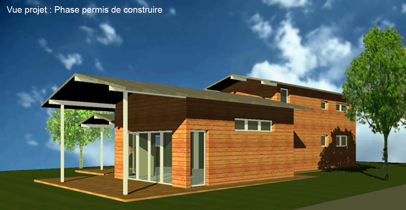 Le projet a été réfléchit sous forme de deux corps de bâtiments de hauteurs différentes, les pignons ouverts sont dirigés vers l’ensoleillement et articulés autour d’une entrée plus basse en long qui vient distribuer ces deux volumes.
