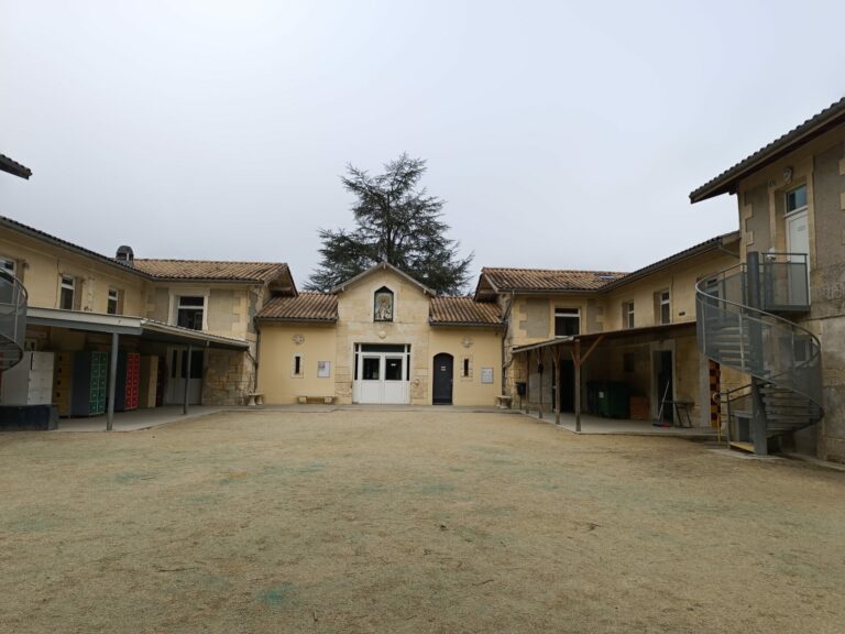 Descriptif : Le collège, un ancien bâtiment en pierres, en forme de U accueille la façade d'entrée et se retourne sur une cour extérieure.