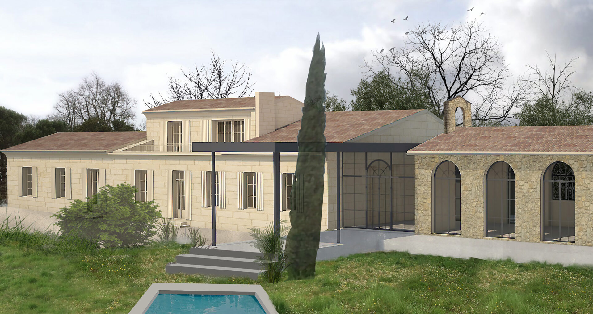 Un choix sur la liaison entre ces espaces et l’avant/arrière de l’habitation a été traité par la mise en place d’un auvent qui traverse tout le hall, le lieu de liaison commun aux espaces existants, réhabilités et crées.