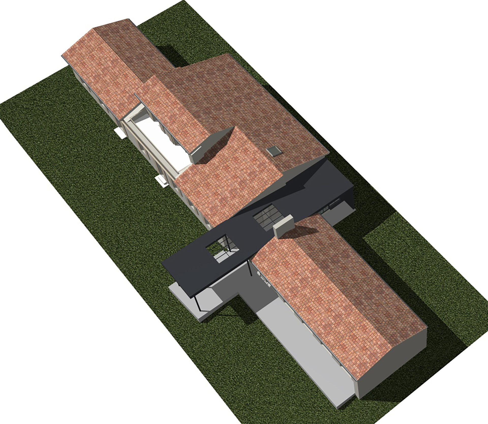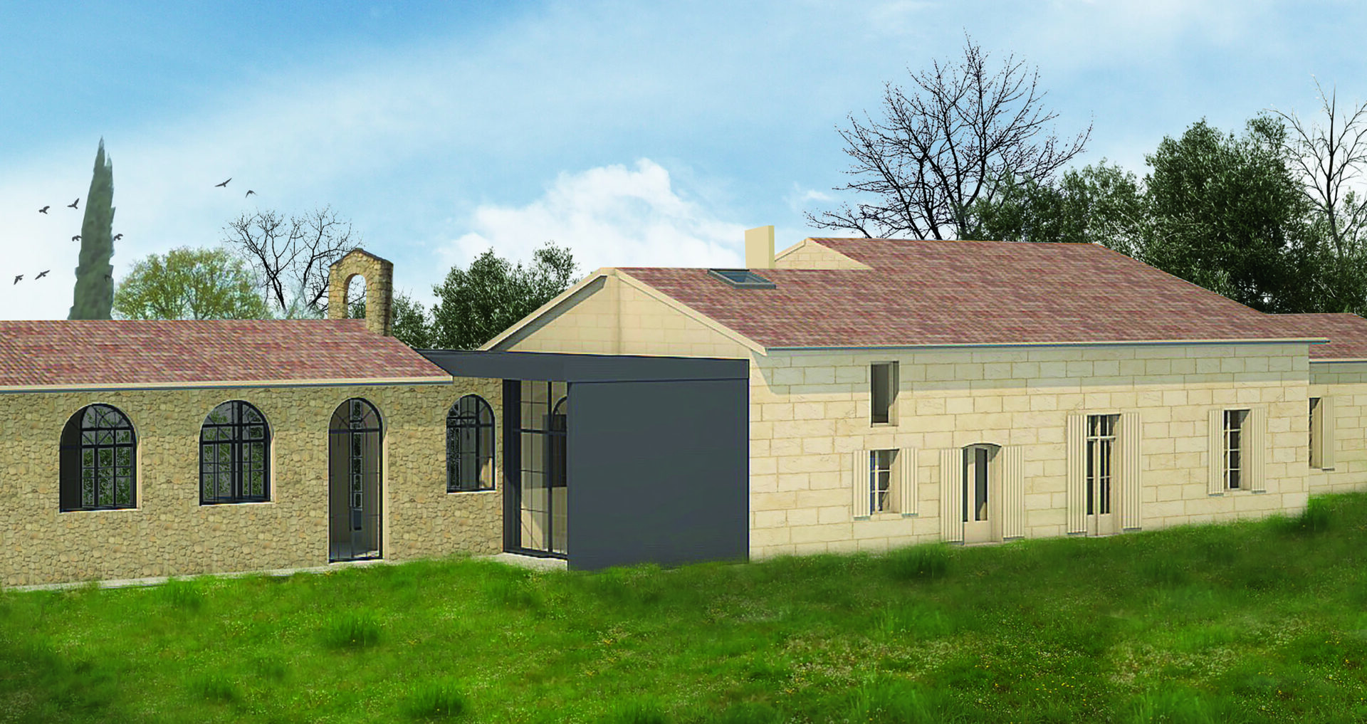 Une surélévation partielle du corps central a été réalisée en prolongeant un pan de toiture existant pour retrouver une volumétrie traditionnelle a 2 pans.